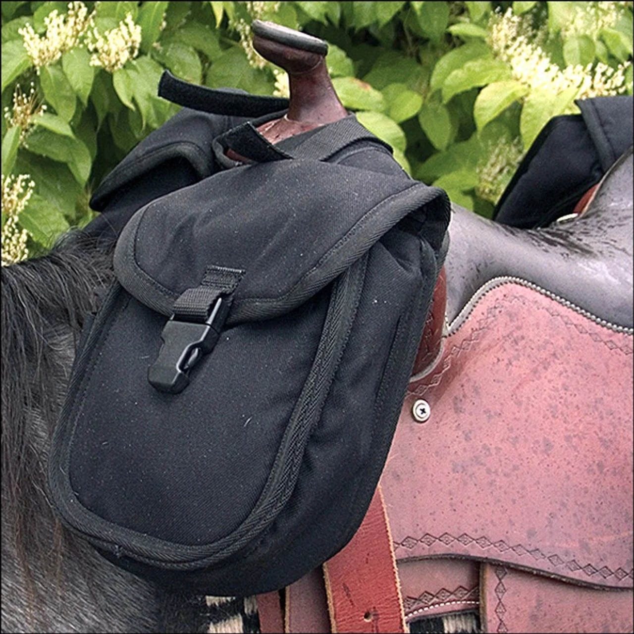 7 inch x 8 inch x 3-1/2 inch.Two padded pockets to hold your essentials. Hook-and-loop straps attach around pommel for maximum security. Buckled straps help hold bags in place. Horn opening is big enough to fit horns on roping saddles.