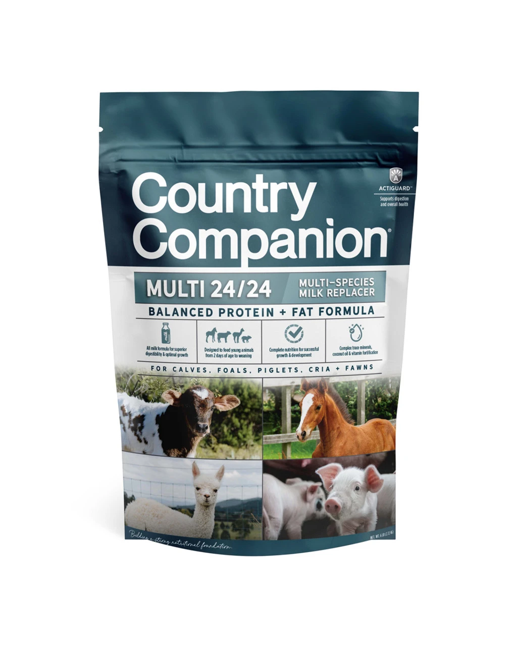 COUNTRY COMPANIONÂ MULTI-SPECIES 24/24 MILK REPLACER is a non-medicated milk replacer designed to allow higher nutrient intake and promote improved average daily weight gain for calves, piglets, foals, llama/alpaca cria, deer fawns and elk calves. Designed to feed young animals from 2 days of age to weaning, Country Companion Multi-Species 24/24 Milk Replacer includes complex trace minerals, coconut oil, vitamin fortification and offers complete nutrition for the successful growth and development of baby animals.