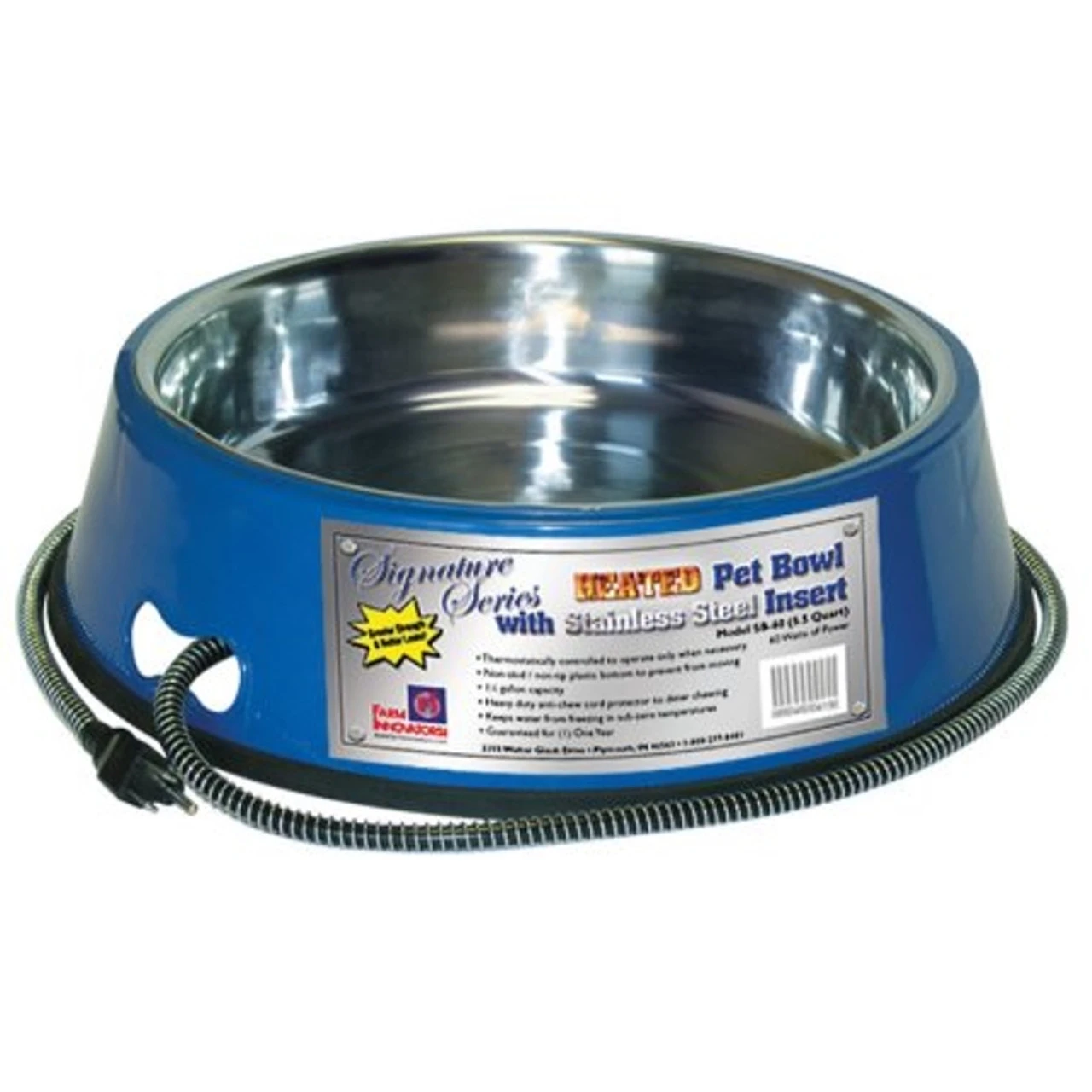 This Heated Stainless Steel Pet Bowl from Farm Innovators™ will prevent icing in sub-zero temperatures. This 5.5 quart bowl has a poly outside with a stainless steel insert. It is thermostatically controlled to operate only when necessary. It has a non-skid/non-tip rubber bottom. The heavy-duty, “”anti-chew”” cord protector deters chewing. The durable stainless steel bowl is easy to clean.