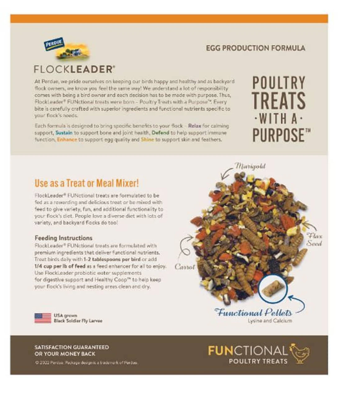 FlockLeader FUNctional treats provide nutritional benefits beyond feed, while also bringing interactive fun to a backyard flock!With five unique formulas, each one of our Poultry Treats with a Purpose is designed to bring specialized benefits to your flock. FlockLeader Enhance is formulated to help birds replenish key nutrients needed for egg production and improve overall egg quality, made with black soldier fly larvae, marigold, carrot, flaxseed, nutrient-enhancing enzymes, and essential amino acids and minerals.SUPPORT EGG PRODUCTION AND QUALITY: Enhance is formulated to help birds replenish key nutrients like calcium needed for egg production and improve overall egg quality for all poultry species 8 weeks of age and older.POULTRY TREATS WITH A PURPOSE: Feed as a rewarding and delicious treat or mix with feed to give variety, fun, and additional functionality to your flockâs diet.INGREDIENTS TO SUPPORT EGG QUALITY: Enhance is made with Vitamin A rich marigold and carrot to enhance the egg yolk, omega-3 rich flax seed to enrich the egg yolk, nutrient enhancing enzymes, an essential amino acids and minerals.EXCLUSIVE FUNCTIONAL PELLET: Enhance is made with an exclusive functional pellet containing key nutrients like the amino acid lysine to support egg production and increase egg weight, zinc to support calcium metabolism and keep bones strong while producing eggs, and manganese to support fat metabolism and liver function.SAFE FOR ALL POULTRY SPECIES: Feed 1-2 tablespoons per bird or add ¼ cup per lb of feed as a meal mixer.