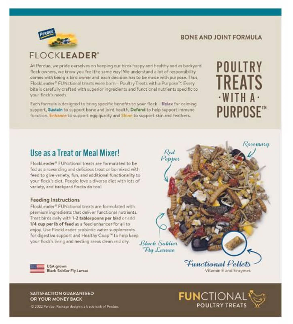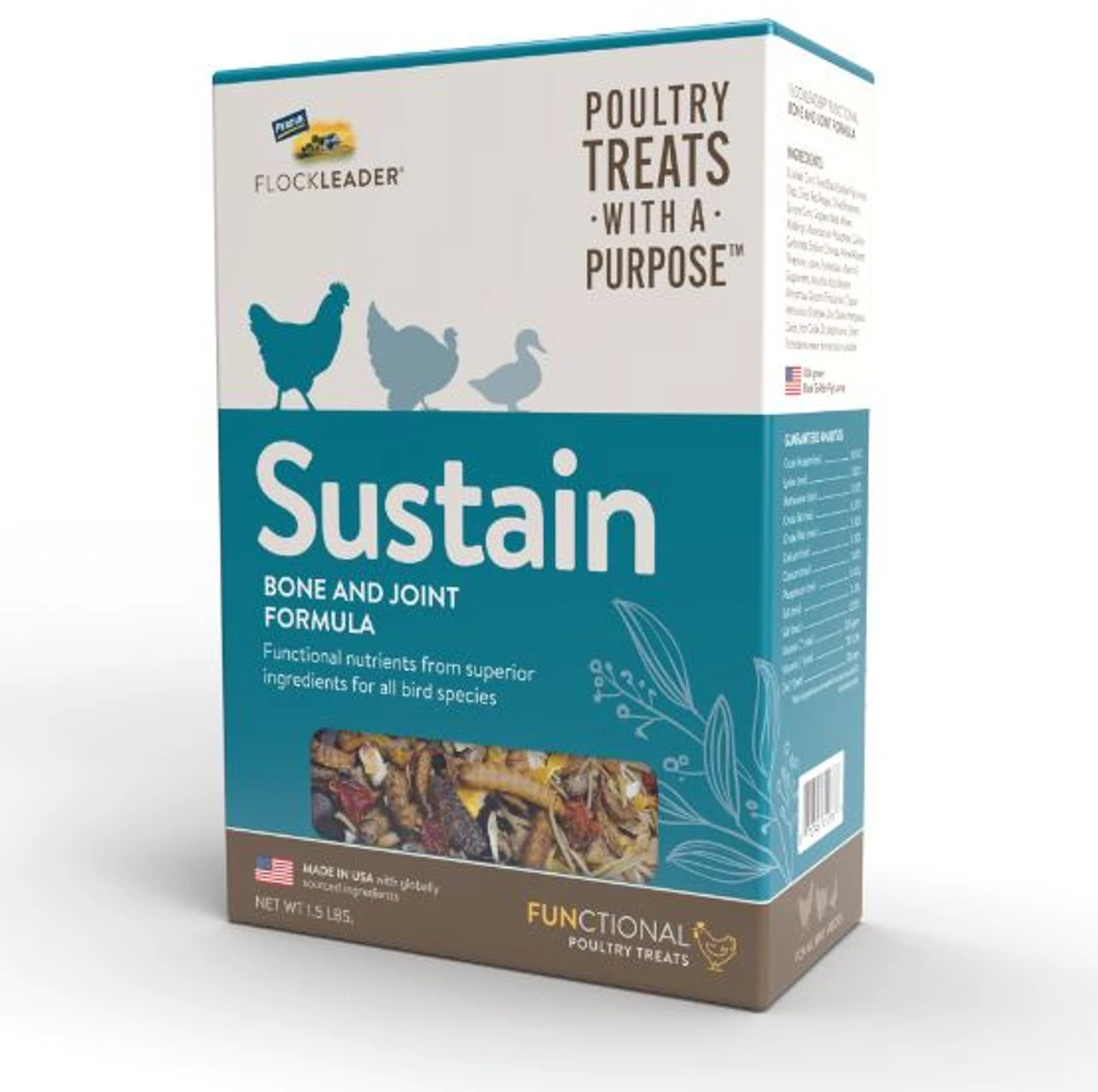 FlockLeader FUNctional treats provide nutritional benefits beyond feed, while also bringing interactive fun to a backyard flock! With five unique formulas, each one of our Poultry Treats with a Purpose is designed to bring specialized benefits to your flock.FlockLeader Sustain is formulated to support birds as they grow and get older, made with black soldier fly larvae, rosemary, red pepper, copper, zinc, and vitamins E and C.SUPPORT BONE & JOINT HEALTH: Sustain is formulated to support all poultry species as they grow and get older. POULTRY TREATS WITH A PURPOSE: Feed as a rewarding and delicious treat or mix with feed to give variety, fun, and additional functionality to your flockâs diet. INGREDIENTS FOR BONE & JOINT SUPPORT: Sustain is made with immune-boosting rosemary to improve liver and kidney function, Vitamin C and calcium-packed red peppers, and bone building chelated copper and zinc, and Vitamins E and C for collagen support. EXCLUSIVE FUNCTIONAL PELLET: Sustain is made with an exclusive functional pellet containing key nutrients like zinc to support calcium metabolism and keep bones strong, Vitamin E for liver health, Vitamin C for immune and antioxidant support, and enzymes to help break down nutrients as birds age. SAFE FOR ALL POULTRY SPECIES: Feed 1-2 tablespoons per bird or add ¼ cup per lb of feed as a meal mixer.