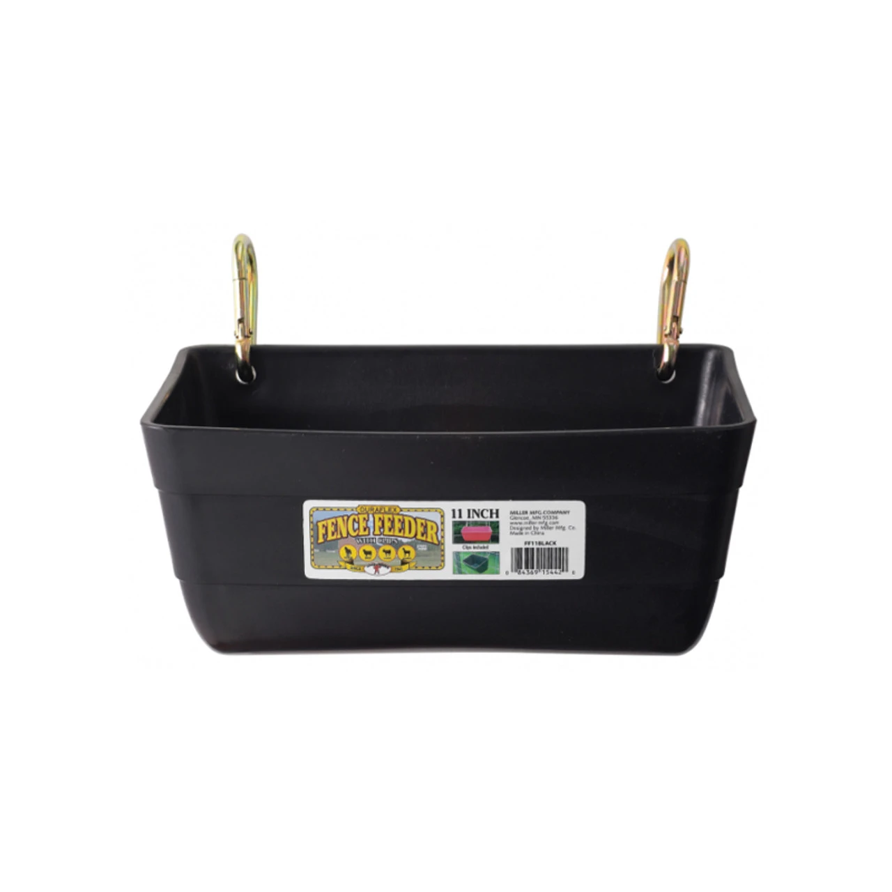 A fence feeder keeps containers off the ground to eliminate spills and waste. It’s a great way to feed grain, pellets, or other feeds outdoors. This feeder comes with two heavy-duty metal clips for hanging on wire fencing for a portable feeder that’s quick to install or move. Or, the feeder can be permanently mounted on a wall or rail by stapling the clips to the wood with fencing staples, or by attaching lag screws (not included) through the eyelets. High-impact polyethylene plastic stands up to tough farm use.