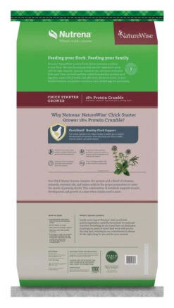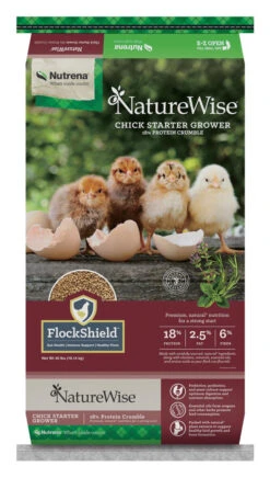 Fortified with vitamins and minerals to support healthy growth and development. Contains a proprietary blend of nutrients to support the immune system and overall health of the chick. Added marigold extract to improve skin coloration. Added prebiotics, probiotics and yeast culture that support digestion for chicks. Crumble form encourages feeding. Feed as sole ration from hatch until 22 weeks, however, layer replacement pullets should be switched to NatureWise Layer at 16 weeks or the onset of lay. Don’t let feeders run empty. Clean feeders and waterers regularly. Provide fresh, clean water at all times. Provide appropriate size grit as needed