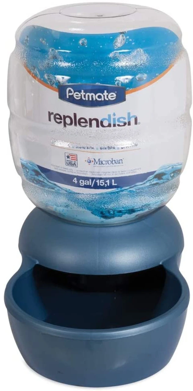 - Gravity Waterer: This 4 Gallon cat and dog water bowl dispenser slowly dispenses filtered water to prolong time between refills. Perfect for pet parents with busy lifestyles. Use with replaceable Petmate Replendish charcoal filters