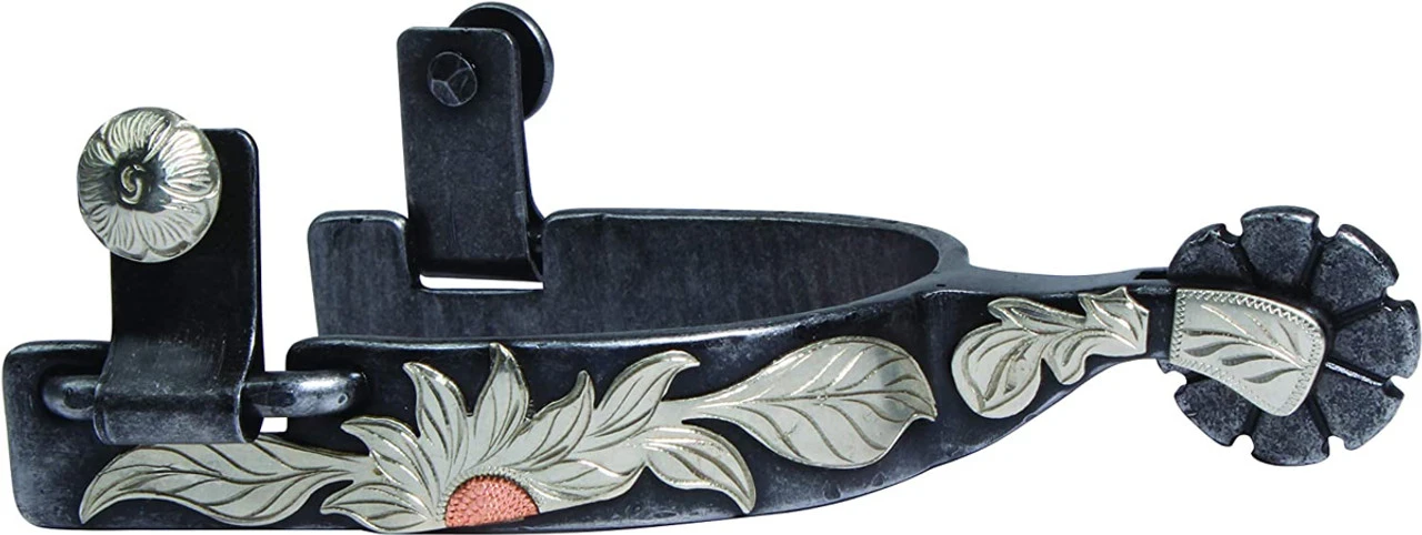 Beautiful handcrafted sunflower design on the 3/4″ band, with a blunt 8 point rowel.