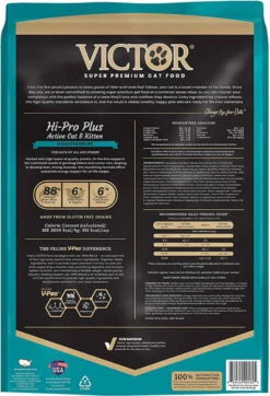 HI-PRO PLUS ACTIVE CAT & KITTEN: This super premium cat food is high protein formula for active indoor and outdoor cats of all life stages. This nutrient-dense dry cat food contains high quality protein to support development of lean, strong muscles and L-Carnitine to aid in converting fat to energy. This super premium cat food is a dry kibble with 34% protein and 18% fat, and is 3809 KCAL/KG or 391 KCAL/CUP. The protein in this nutrient-rich cat food comes from premium meat sources (88%), plants and veggies (6%), and grain sources (6%). We proudly produce every bag of VICTOR Super Premium dry cat food in our own Texas-based facility; each ingredient used is carefully selected and serves a nutritional purpose. A majority of the ingredients come from ranches, farms and other trusted suppliers who are within a dayâs drive of our East Texas plant. Every bag of VICTOR cat kibble is created with our proven Feline VPRO Blend of ingredients â an exclusive mix developed by industry-leading experts to support a healthy coat, promote digestive and immune system function, and maintain a healthy weight. And the result is visible: healthy, happy pets who are ready for the next adventure